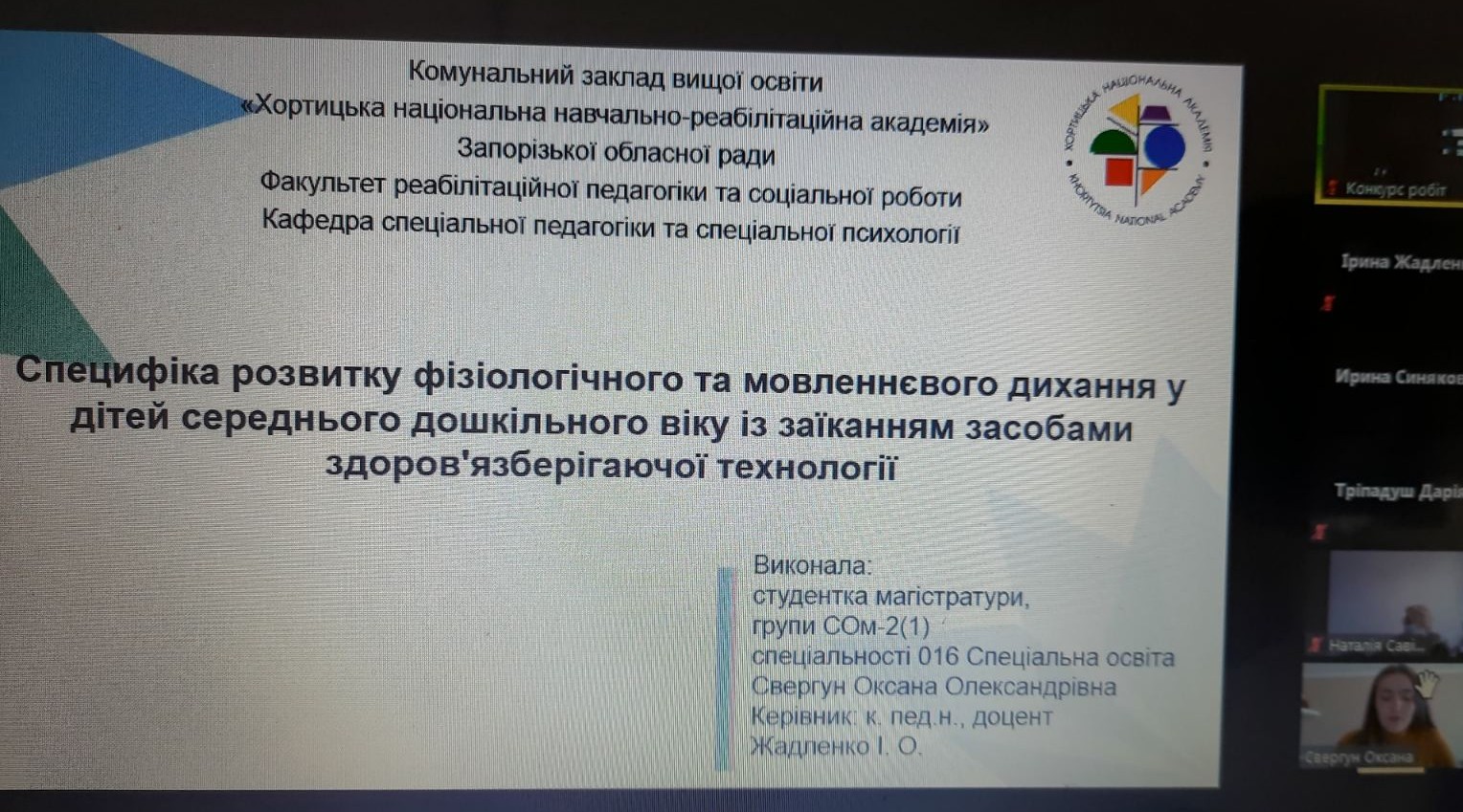 8 квітня 2021 року відбулася підсумкова науково-практична конференціяВсеукраїнського конкурсу студентських наукових робіт із галузей знань іспеціальностей у 2020/2021 н.р. за напрямом «Актуальні проблеми інклюзивноїосвіти», в якому прийняла участь студентка магістратури спеціальності061 Спеціальна освіта Хортицької національної академії Кіріллова...